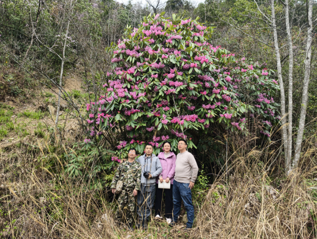 3月24日至25日,我园生态所科研人员赴株洲炎陵县开展井冈山杜鹃专项调查。继2025年在该区域发现2株国家二级保护植物井冈山杜鹃后,本次调查新发现结构稳定的自然群落1个。群落内共有井冈山杜鹃42株,其中最大一株地径22.0cm,株高4m,冠幅4m×5m,伴生植被有鹿角杜鹃、山矾、楤木、野鸦椿等。
