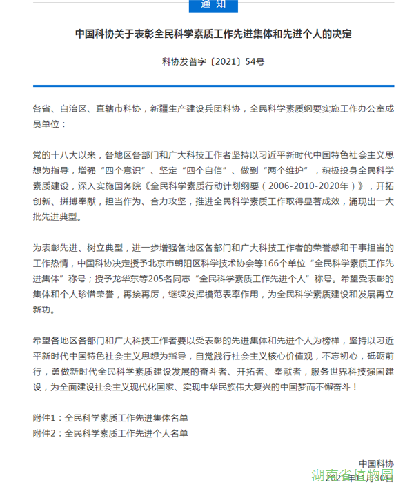 根据《中国科协关于开展全民科学素质工作先进集体和先进个人评选表彰工作的通知》要求,经湖南省科协推荐、全国评比达标表彰工作协调小组评审,我园被评为“全民科学素质工作先进集体”。