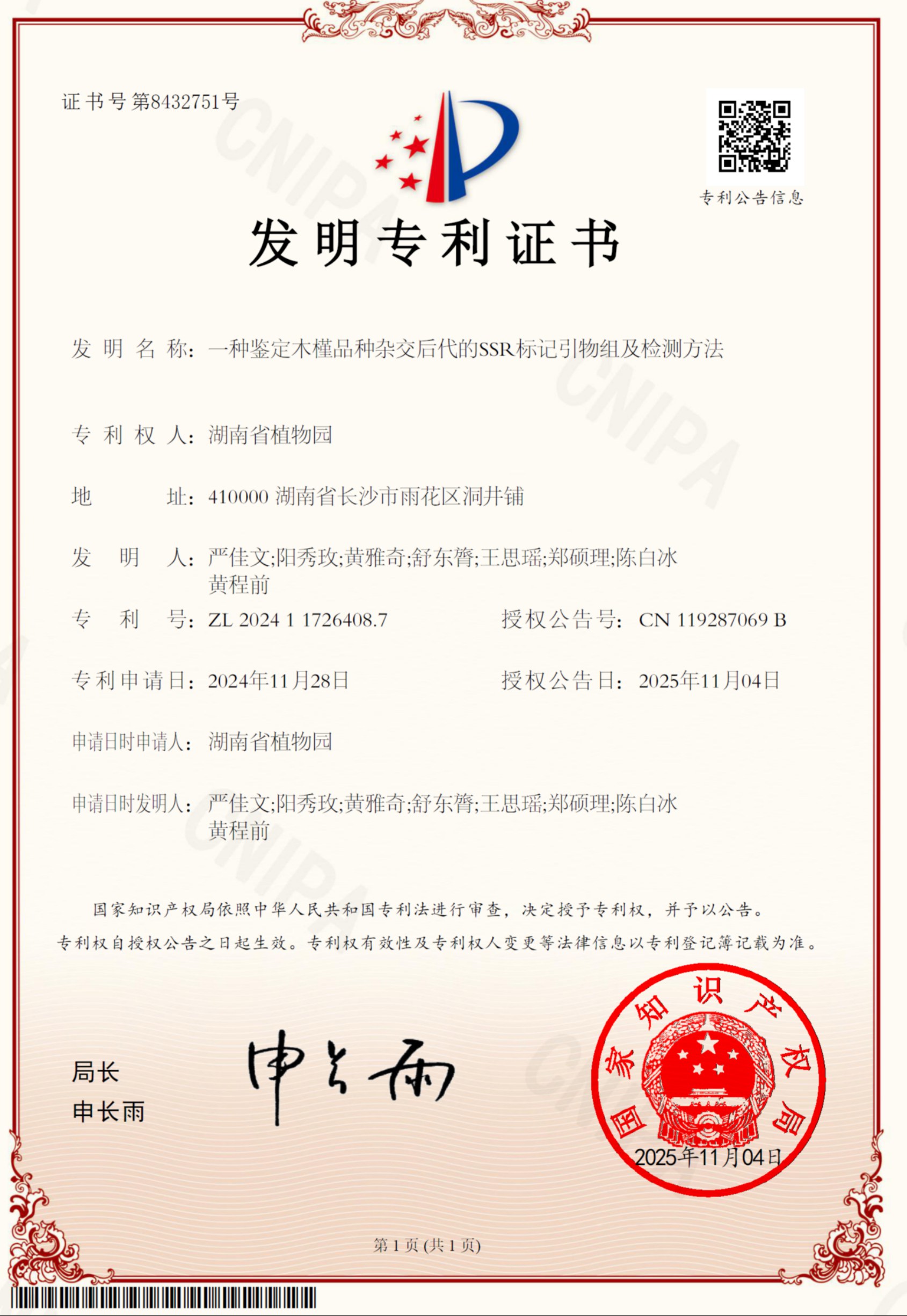 研究成果发表学术论文6篇,申报国家发明专利4项,其中《一种鉴定‘湘妍’和‘湘韵’樱花杂交后代的InDel标记引物组合及检测方法》《一种钟花樱种质资源的InDel标记引物组合及其应用》等3项专利已于2025年12月获国家知识产权局授权,标志着我园在樱花分子标记辅助育种研究领域稳居全国领先水平。(撰稿/严佳文 编辑/余帆 编审/李蔚婷)
