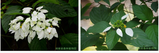2018年7月,我园湖南本土植物全覆盖项目组在吉首采到了真正的异形玉叶金花标本,5个花萼裂片全部扩大成叶状,与大叶白纸扇M.shikokiana非常相似,但每一个增大的花萼裂片均要比大叶白纸扇的叶状花萼裂片大。仅凭标本描述和一些园艺变异现象将异形玉叶金花处理为大叶白纸扇的异名,证据还不够充分,下一步我们将通过DNA测序,进一步确定异形玉叶金花和其他近缘种的关系。无论异形玉叶金花是否只是大叶白纸扇的畸变个体,其研究价值和观赏价值不容忽视,我们还将进一步进行遗传学实验,扩大繁殖种苗,让世人都能够欣赏到这一消失了83年、唯一没有找到的30种国家Ⅰ级重点保护植物的容颜。