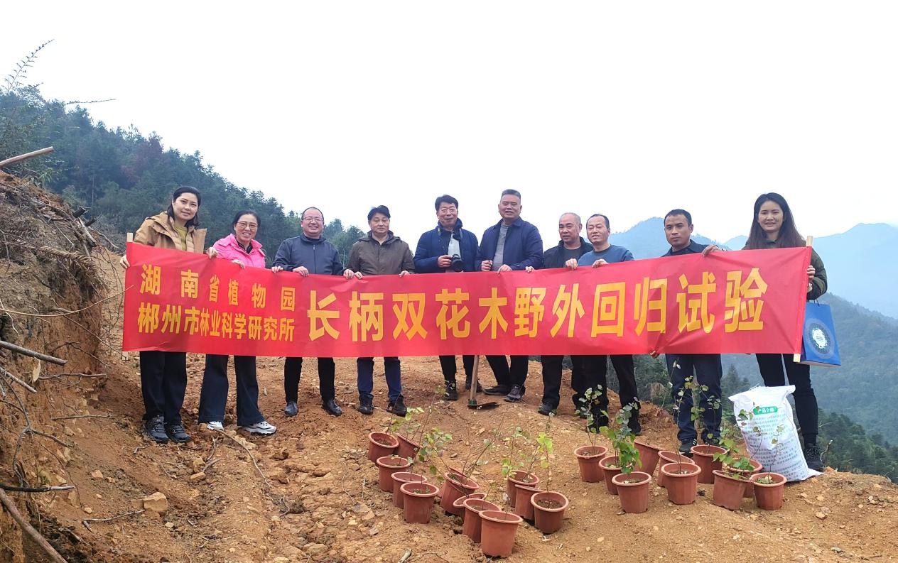 12月9日,省植物园资源所联合郴州市林科所组织实施的2024年中央财政提前批国家重点野生动植物保护补助“长柄双花木遗传资源调查和繁育”项目,在郴州市宜章县骑田岭开展野外回归工作。通过前期调研,项目组在该物种野外资源收集地附近筛选了生境气候类似区域,将30株人工繁育苗木进行了迁地保护和野外回归,并启动了野外回归监测工作。