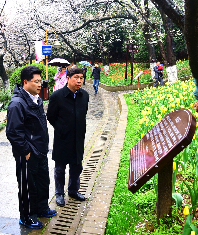 隋忠诚副省长边考察边询问了解,特别是对名花广场的郁金香、风信子、新建桃园里的桃花新品种以及花色各异的杜鹃花兴致盎然,不时与同行的胡长清厅长以及彭春良书记等询问交流。他表示,这里的樱花树之大、树冠之美堪称国内之最。对园内4500多种植物构成的物种多样性之美、日本红枫的娇艳、鹿角杜鹃的秀美、红山茶花型之奇特以及花榈木之珍贵赞不绝口。对湖南省植物园展示生态文化的做法表示赞同。