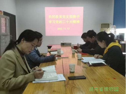 近日,自然教育党支部全体党员在宣教中心二楼党员活动室开展党的二十大精神集中学习主题党日活动,把思想统一到党的二十大精神上来,把力量凝聚到党的二十大各项任务上来。园领导蒋利洪以普通党员身份参加并指导会议。