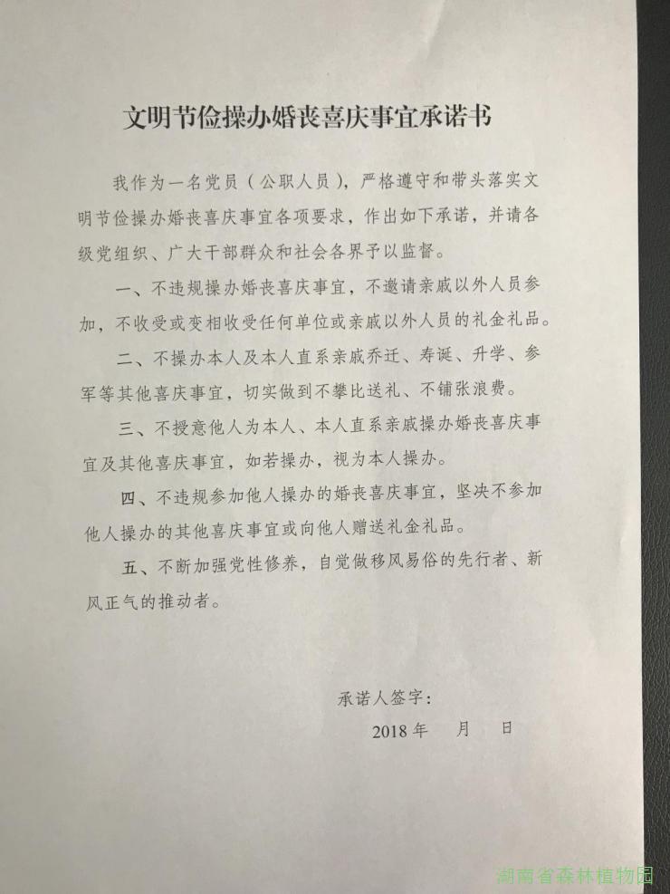 为深入贯彻落实习近平新时代中国特色社会主义思想和党的十九大精神,大力弘扬勤俭节约的传统美德,推动移风易俗,破除陈规陋习,促进党风政风和社风民风持续向善向上。日前,园纪委(监察室)在全园范围内开展签订文明节俭操办婚丧喜庆事宜承诺书。
