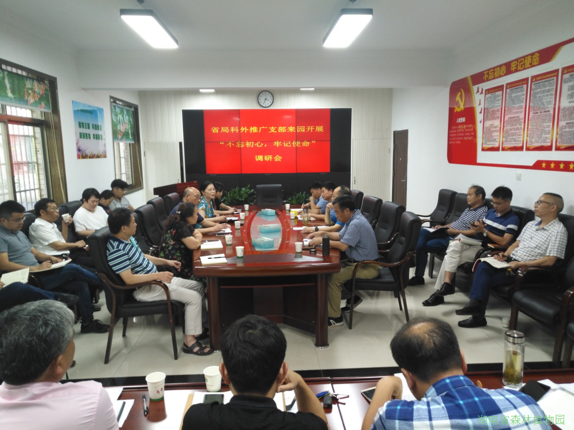 7月1日,在喜迎中国共产党九十八岁华诞之日,省林业局科外推广支部来我园开展“不忘初心 牢记使命”专题调研。省局科外处处长姜芸、省林业科技推广总站站长杨建飞、科外推广支部全体成员、园副主任何友军和李柏海、各研究所主要负责人及科管处全体人员参与了调研。调研会由园副主任李柏海主持。