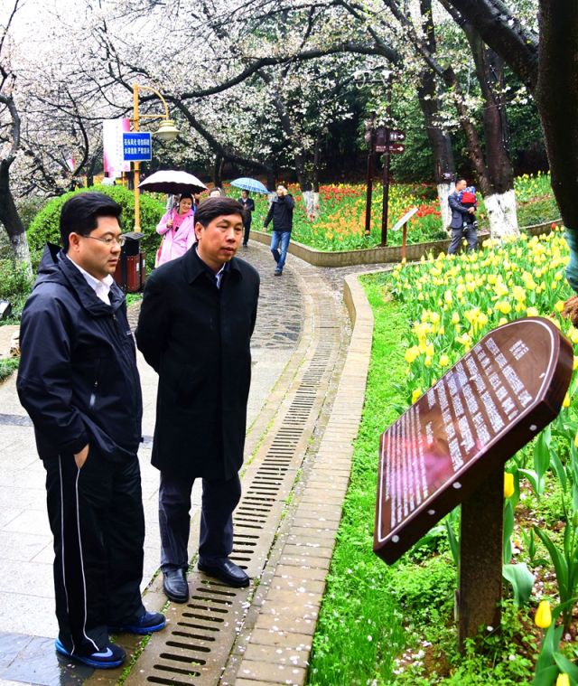 隋忠诚副省长边考察边询问了解,特别是对名花广场的郁金香、风信子、新建桃园里的桃花新品种以及花色各异的杜鹃花兴致盎然,不时与同行的胡长清厅长以及彭春良书记等询问交流。他表示,这里的樱花树之大、树冠之美堪称国内之最。对园内4500多种植物构成的物种多样性之美、日本红枫的娇艳、鹿角杜鹃的秀美、红山茶花型之奇特以及花榈木之珍贵赞不绝口。对湖南省森林植物园展示生态文化的做法表示赞同。