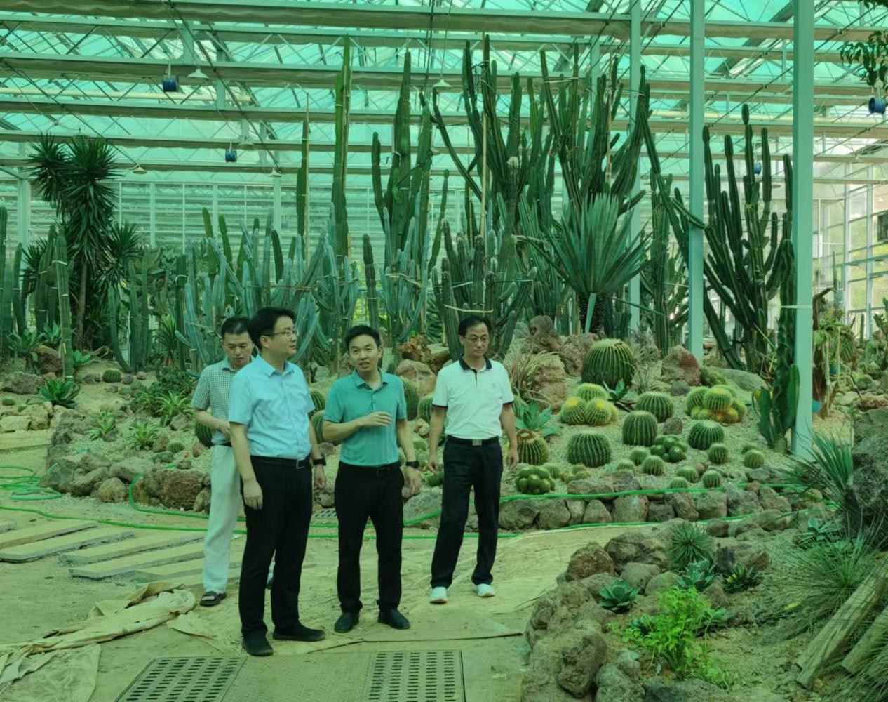 林涛一行实地考察了在建的科研展览温室,先后参观了热带雨林馆、沙生植物园、亚高山植物馆、世界名花馆,随后进行座谈交流。交流会上,廖菊阳介绍了我园基本情况、园区特色和近年来所取得的工作成效,双方就植物园建设运营、植物资源保护利用等方面展开了交流和探讨。