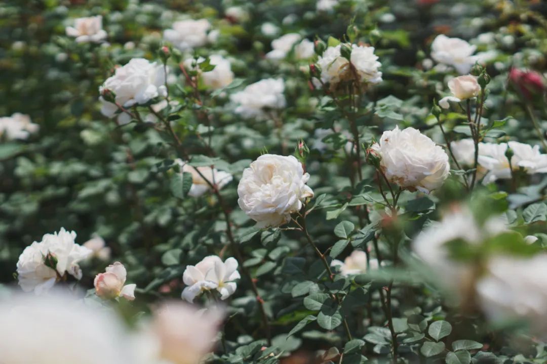 白雪山:色泽呈白玉色,花瓣边缘带有淡淡的粉色,枝干上有小刺。走进细嗅,清香无比。