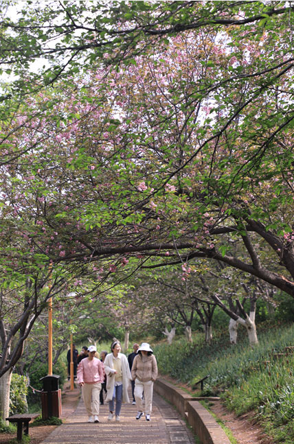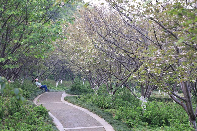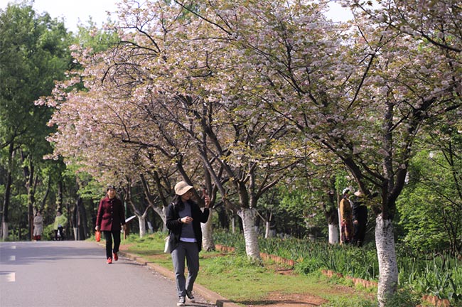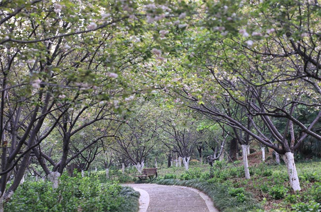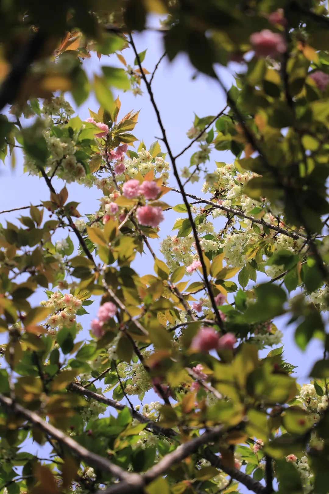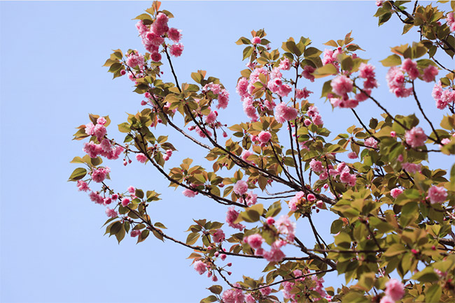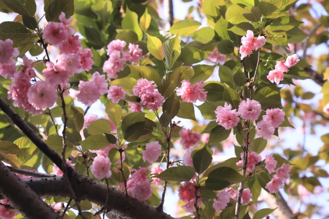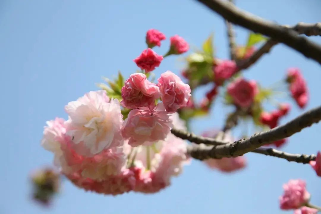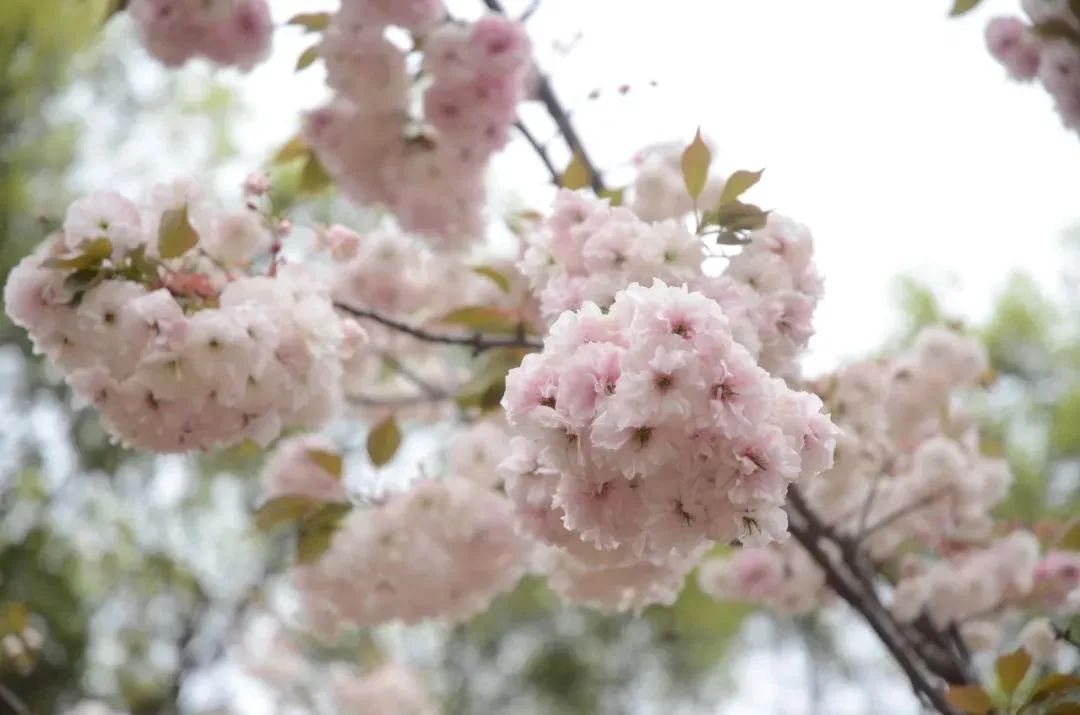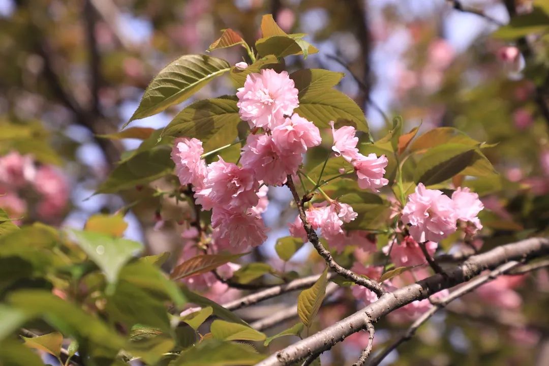 普贤象樱:为晚樱品种代表之一,花开时外侧的花瓣边缘淡红色,中部近白色,2枚雌蕊弯成象牙状突出来,因像普贤菩萨乘坐的大象而得名。花叶同放,幼叶红褐色,花瓣21-50枚,雌蕊通常2枚,下半部分叶化。花期3月底至4月中旬。