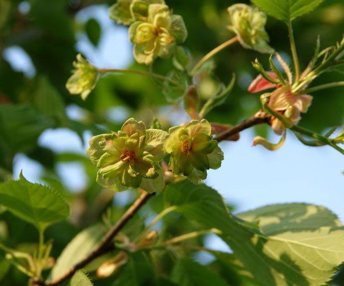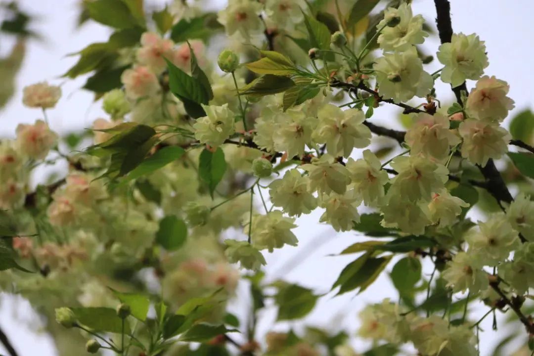 御衣黄樱:该品种早在江户时代前期京都的仁和寺里就有栽培。因为花色接近贵族服饰中被称为“萌黄”的颜色而得名。刚开时花色为明亮的绿色,慢慢会变白,中心略带红色。花瓣10~15枚,花直径3.5~4.5cm。