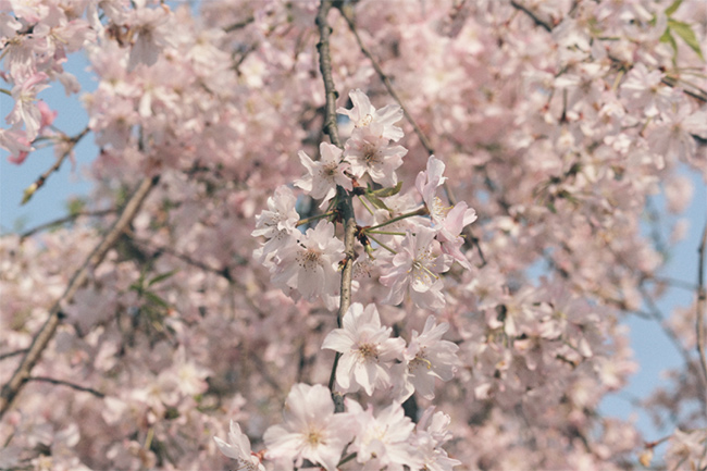 顾名思义,垂枝樱的枝条是往下垂的,形似柳树。下面图片里的这种垂枝樱名为‘八重红枝垂’,它的花瓣淡紫红色,姿态美丽而独特。‘八重红枝垂’主要分布在樱花湖大坝上,花期一般稍晚于‘染井吉野’樱。