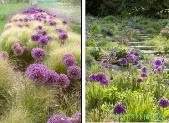 但是观赏草一般冬季枯萎,大多数到三月才萌发,在此期间往往留下枯黑的草茬和裸露的泥土,很不美观。如果在观赏草里加入秋植球根花卉如郁金香、大花葱则完美解决了这个问题。秋植球根花卉秋冬季种植,冬季正好萌发出土,绿意浓浓,春季则娇艳缤纷,此时观赏草开始长出绿油油的丛状新叶,形态互补,空间交错,搭配十分相宜。春季过去,球根花卉休眠不见踪影时,观赏草则绿意盎然,并逐渐进入最佳观赏季,夏秋季它们是耀眼的主角。如此轮回,球根花卉和观赏草可谓最佳搭档。