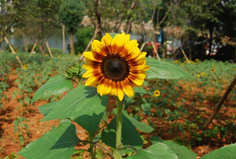 向日葵的品种根据用途不同,可分为油用型、食用型和观赏型三种,我们园内展示的向日葵大多数是观赏向日葵,色彩鲜艳,花色、花型丰富,有矮化分枝型、单杆切花型、高杆分枝型等等。向日葵原产美洲,现在世界各国均有栽培,通过人工培育,在不同生境上形成许多品种。