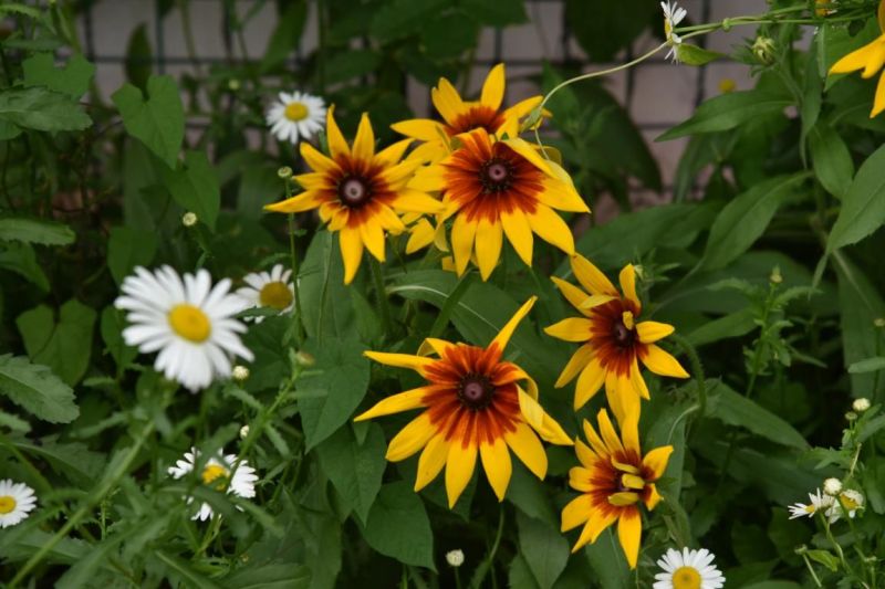 5月,春夏之交,春季开花的花卉一一谢幕后,一些全新的角色开始争奇斗艳。比如高大的黑心菊、纯白的大滨菊、繁花满枝的庭菖蒲等等(分别附图如下)。