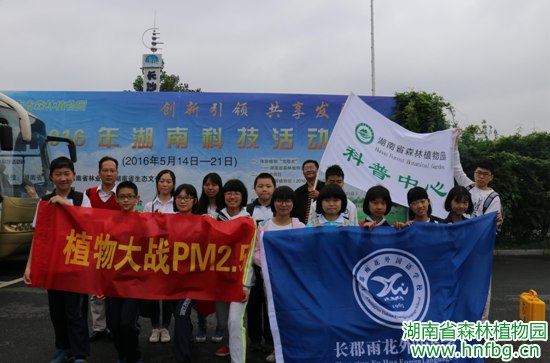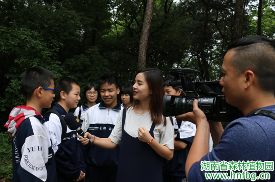 5月21日上午, 2016年湖南科技活动周的最后一天,园生态景观环境研究所的李高飞博士为长郡雨外初二年级的十多名同学带来了一场精彩的科学实践活动,活动主题为:植物大战PM2.5。李博士首先通过PPT讲座向同学们介绍了什么是PM2.5,主要来源和对人体的危害,然后重点介绍了植物对PM2.5的阻控作用。然后,李博士带着同学们来到三湘功臣纪念碑、竹园等地进行实地观测,并指导同学们对观测数据进行记录。湖南都市频道《青春体验式》栏目到现场进行拍摄并会做后期报道。