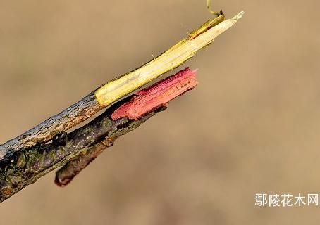 在古代,被称为红梅的主要是宫粉梅与朱砂梅。宫粉梅花色呈深红或浅粉红。朱砂梅典型的品种花色接近朱砂的颜色,开花时红艳如火,热烈豪放。但并不是所有朱砂梅品种是深红色的花,比如我园栽植最多的朱砂品种‘骨里红’,花瓣实际上接近淡紫红色,让人误以为是宫粉梅。其实宫粉梅与朱砂梅的判断,不看花色,而是看小枝断面的颜色。宫粉梅的小枝条断面是绿白色或黄白色,朱砂梅的小枝条断面是紫红色的,这是朱砂梅典型的特点,故又被称为“骨红梅”。