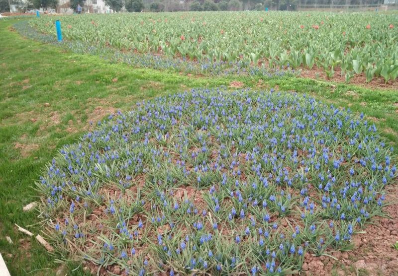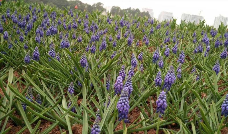 葡萄风信子性喜温暖、凉爽气候,喜光亦耐阴,花期早、其开花时间较长,常与郁金香搭配作出各种图案或是用于成片与镶边种植等,都有良好的观赏效果。
