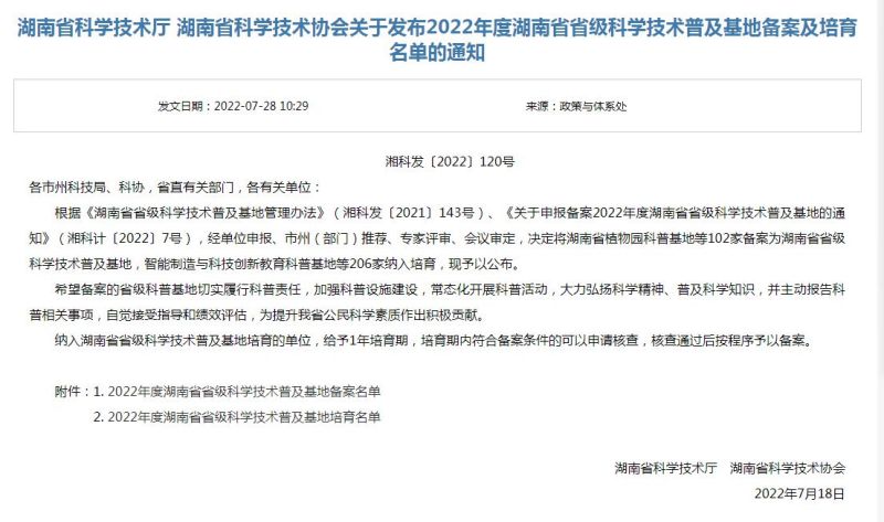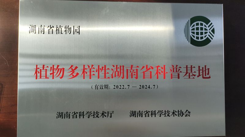 根据《湖南省省级科学技术普及基地管理办法》、《关于申报备案2022年度湖南省省级科学技术普及基地的通知》),经单位申报、市州(部门)推荐、专家评审、会议审定,我园科普基地备案为湖南省省级科学技术普及基地,被授予“植物多样性湖南省科普基地”称号牌匾。