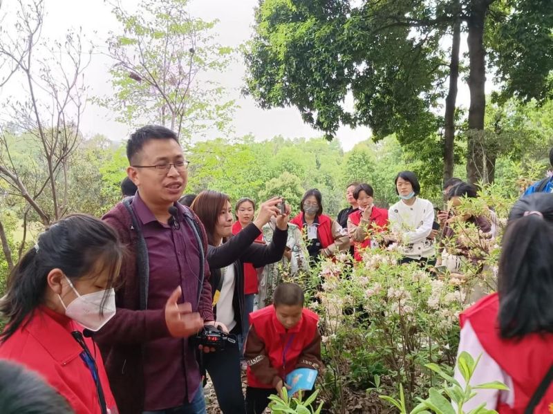 为全面提升2023年湖南生态旅游节暨湖南省植物园樱花节科普志愿者讲解服务水平,4月2日,自然教育中心组织春季花展科普志愿者开展了杜鹃花专场培训。