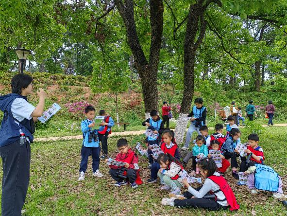 4月4日, 湖南省“爱鸟周”活动启动仪式在我园举行,呼吁大家携起手来,共同关爱鸟类,守护生态家园,为鸟类创造一个和谐宜居的环境,让人与自然和谐共生。为响应活动号召,旅游公司组织开展了以“观鸟季来了,和鸟儿来个‘贴贴’”的鸟类专题研学活动,活动开设了三个场次,深受小朋友的喜爱。