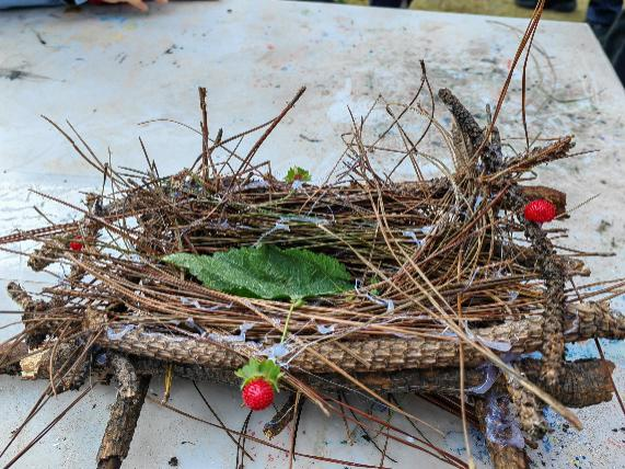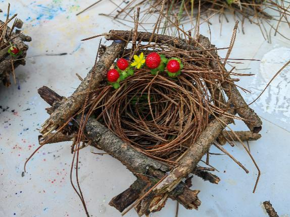 手工环节,孩子们用树枝、松针、野果等自然材料,学习鸟儿的“大智慧”、根据户外鸟窝的观察以及课堂上学习不同鸟类的习性和搭鸟窝的不同方式等,用自己独到的见解为鸟儿安个温馨的家,每一个孩子都是“鸟窝搭建小达人”。