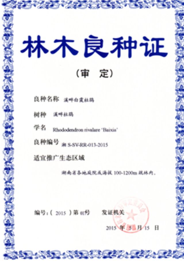 近日,由省植物园选育的“溪畔白霞”杜鹃(Rhododendron rivalare‘Baixia’)新品种通过湖南省林木品种审定委员会组织专家会议审定通过,获2015年度省级林木良种(湘S-SV-RR-013-2015)。