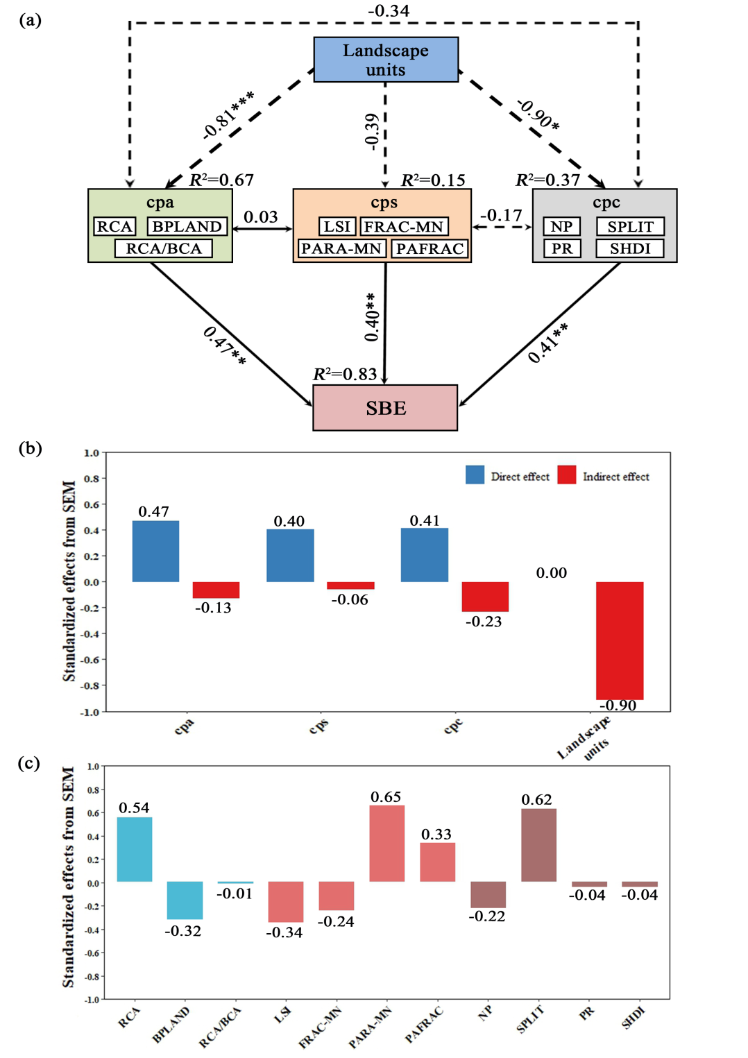 (a)具有标准化系数和解释方差(R2)的路径图。(b,c)景观指标对SBE的标准化直接和间接影响。cpa:色彩斑块的面积百分比;cps:色彩斑块的形状;cpc:色彩斑块的空间分布;*:p < 0.05;**:p < 0.01;***: p < 0.001