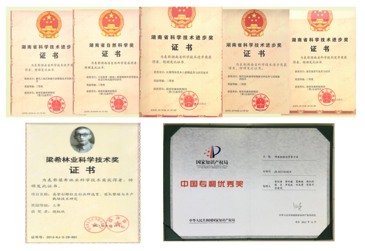 湖南省科技进步二等奖1项,湖南省科技进步三等奖2项,湖南省自然科学奖1项,梁希林业科技进步奖1项,中国专利奖优秀奖1项,湖南省第十五届自然科学论文一等奖1项。