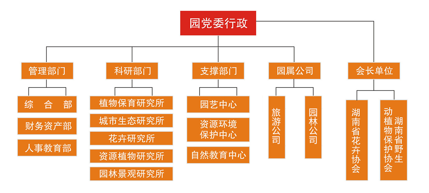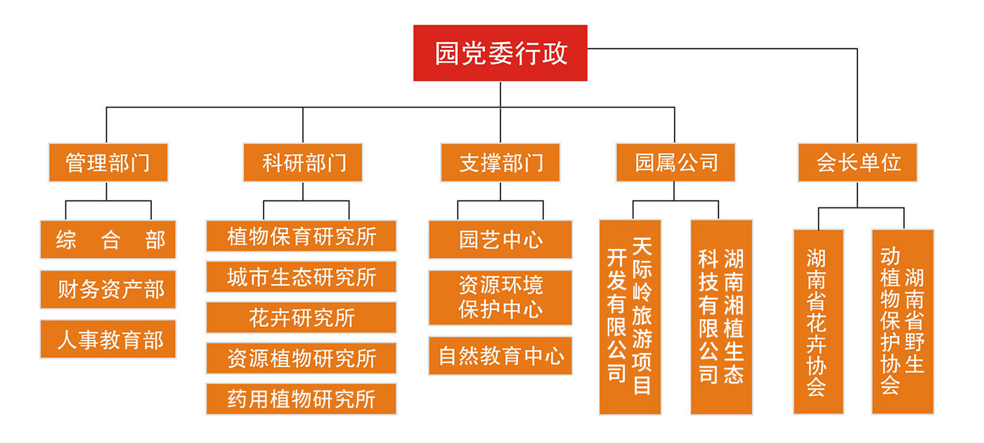 全园现有事业编制110个,共设11个部门和2个园属公司,包括综合部、人事教育部、财务资产部3个管理部门;植物保育研究所、城市生态研究所、花卉研究所、资源植物研究所、药用植物研究所5个科研部门;园艺中心、自然教育中心、资源环境保护中心3个支撑部门;天际岭旅游项目开发有限公司、湖南湘植生态科技有限公司2个园属公司。2009年、2018年,湖南省林业局先后批准南岭植物园和怀化植物园成为我园分园。2018年、2019年、2022年成立了八大公山、城步南山、大围山植物学研究站,作为近地保育场所。此外,湖南省花卉协会、湖南省野生动植物保护协会也归口在我园统一管理。