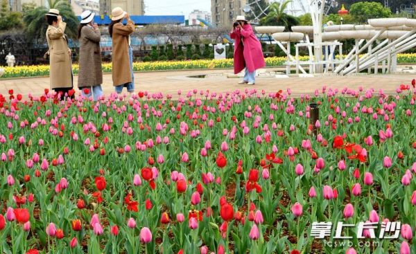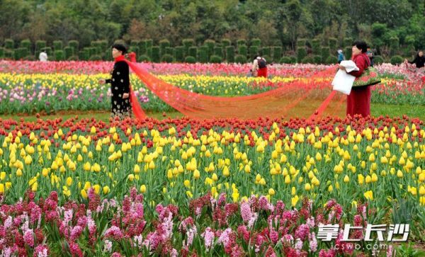 省植物园郁金香盛开,吸引不少女性入园赏花。均为长沙晚报全媒体记者贺文兵摄
