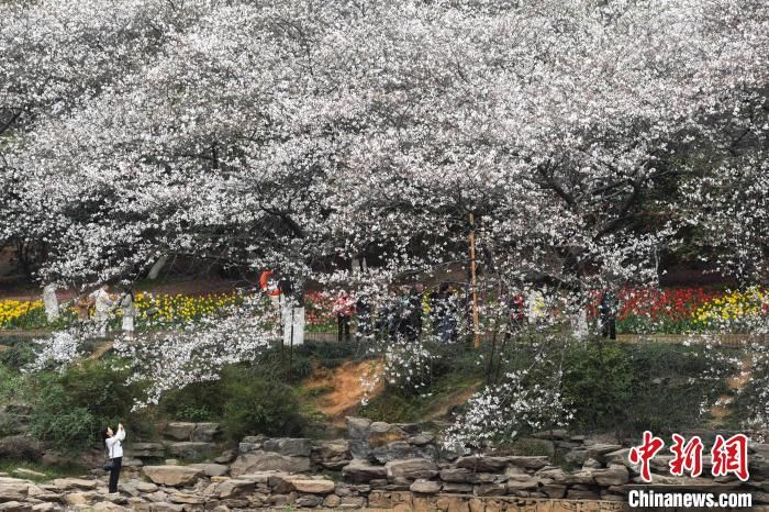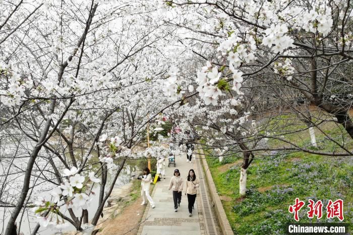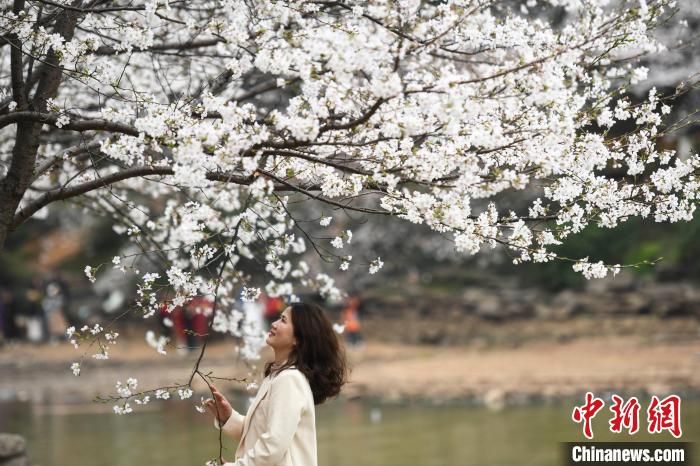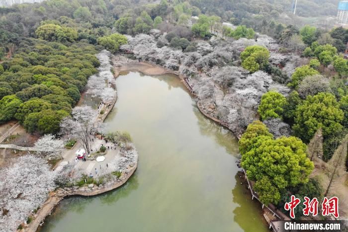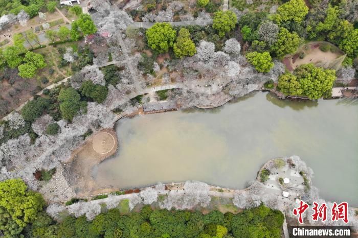 犹如“春雪”的樱花覆盖在园内湖畔四周。杨华峰摄