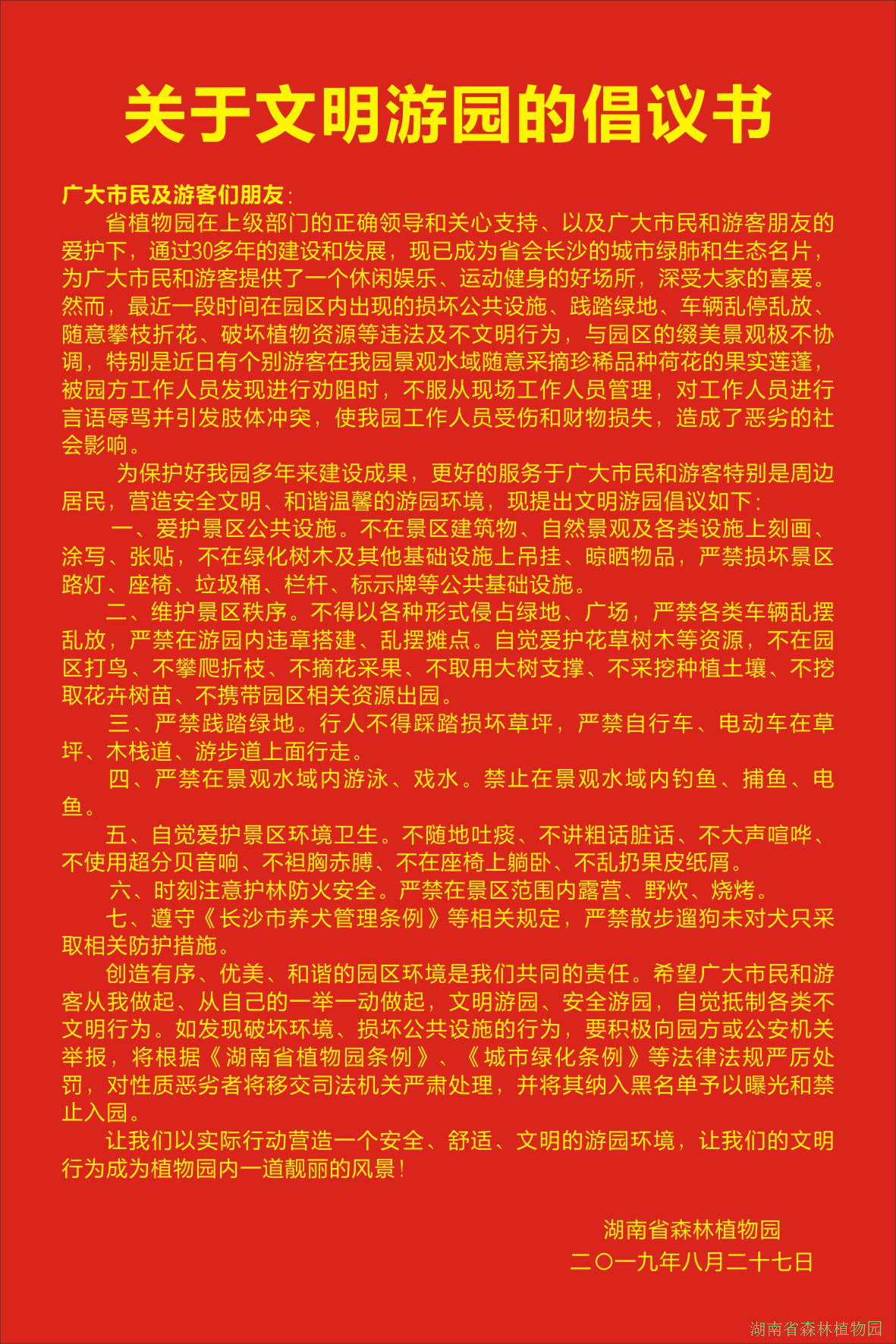 针对园区近段时间出现的损坏公共设施、践踏绿地、车辆乱停乱放、折花断枝等违法及不文明行为,8月28日,我园发布“文明游园倡议书”,倡议游客文明游园,共同打造文明和谐有序的园区环境。