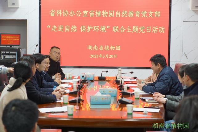 省科协办公室副主任蒋电波同志表示,双方要继续加强交流合作,开展更丰富的主题党日活动,结合双方优势,促进发展。最后,省科协党组成员、办公室主任马文胜同志做总结讲话,他指出,本次主题党日活动是为了贯彻执行党中央“在全党大兴调查研究”的指示精神,湖南省植物园作为全国科普教育基地、全国十三五全民科学素质先进集体单位,在全省的科普教育尤其是青少年科学教育上做出了积极贡献,今天在植物园实地所见所听确实收获匪浅,希望省植物园能在科普人才培养和职称晋升上给予倾斜和支持,进一步夯实科普人才队伍。同时希望省植物园能和全省科普平台积极开展交流合作,为湖湘科学家精神传播、全民科学素质提升等工作做出更大贡献。