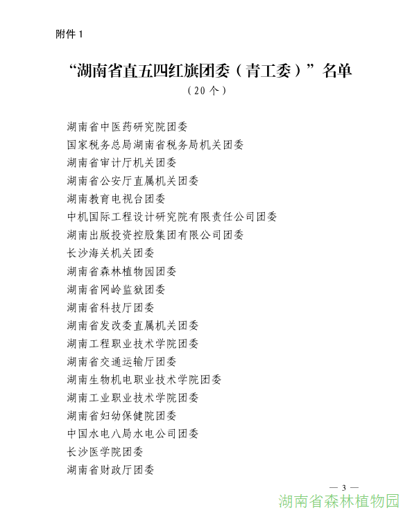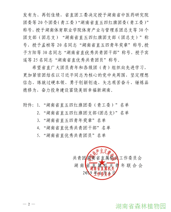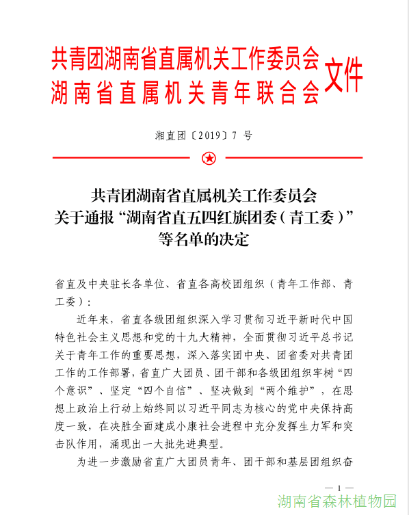 近日,从湖南省直团工委、省直青联联合下发的《关于通报 “湖南省直五四红旗团委 (青工委) ”等名单的决定》(湘直团[2019]7号)文件获悉,湖南省植物园团委在五四运动100周年之际获评“湖南省直五四红旗团委”荣誉称号。