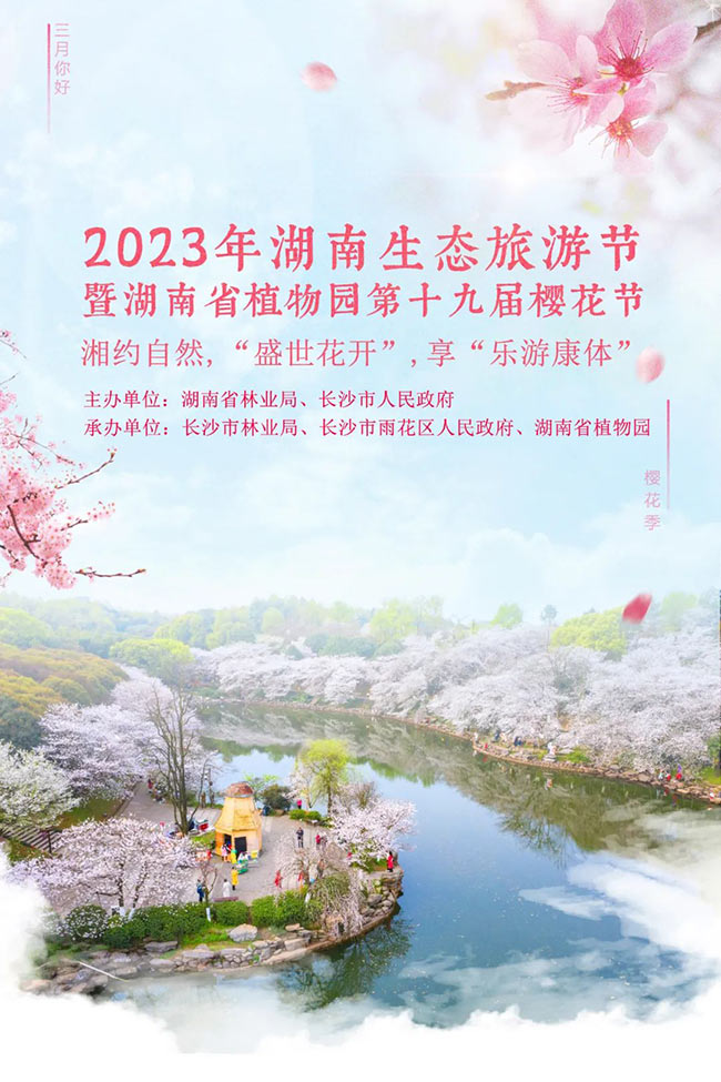 本次活动由湖南省林业局、长沙市人民政府主办,长沙市林业局、长沙市雨花区人民政府、湖南省植物园承办,活动时间从2023年3月至5月。以“湘约自然,看‘盛世花开’,享‘乐游康体’”为主题,让市民在赏花时体验湖南生态旅游资源的丰富和美好。