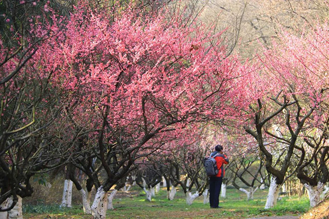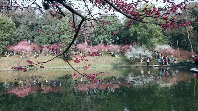 省植物园的梅花独具特色,主要分布在樱花湖畔、樱花大道、竹园、樱花园等核心景区,梅花园占地面积约为20000平方米,分为梅溪双映、青梅竹马、岁寒三友、梅香亭等六个区,具有11种梅花类型、三十个品种400余株古梅。包括垂枝梅、龙游梅、美人梅等多个名贵梅花品种,基本涵盖观赏梅花的所有类型。