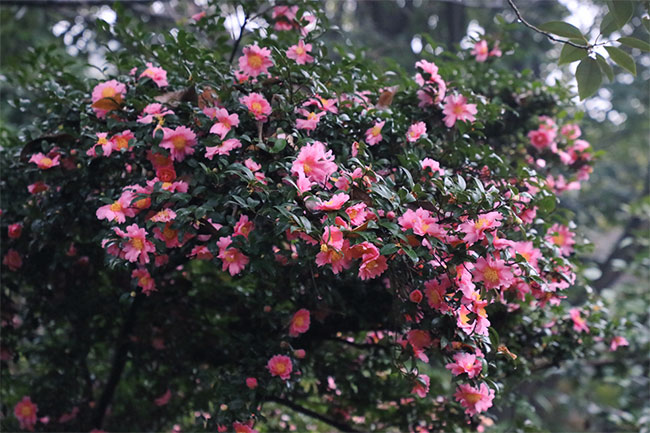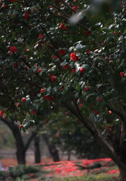 山茶怒放,锦枝纤柔缀弯枝头