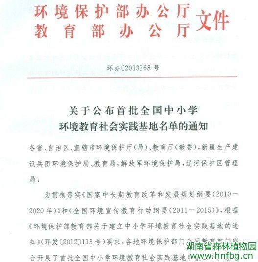 为贯彻落实《国家中长期教育改革和发展规划纲要(2010—2020)》和《全国环境宣传教育行动纲要(2011—2015)》,根据《环境保护部教育部关于建立中小学环境教育社会实践基地的通知》要求,各地环境保护部门会同教育部门联合开展了首批全国中小学环境教育社会实践基地申报工作,经环境保护部、教育部联合组织专家评审,湖南省森林植物园等80家单位,成为了首批“全国中小学生环境教育社会实践基地”,湖南省仅有4家。