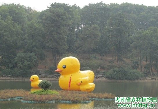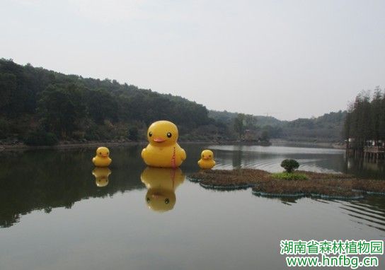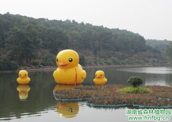 10月26日,植物园樱花湖畔迎来了三位可爱的“动物朋友”,它们是一只6米高的鸭妈妈和两只2米高的鸭宝宝,它们的到来使美丽宁静的樱花湖更多了一份灵动与温馨。此次,为了丰富我园“秋之色”花展氛围,打造新的游园亮点,旅游中心特地从上海定制了这批可爱的鸭鸭们。瞧,它们正微笑着等待您的到来!