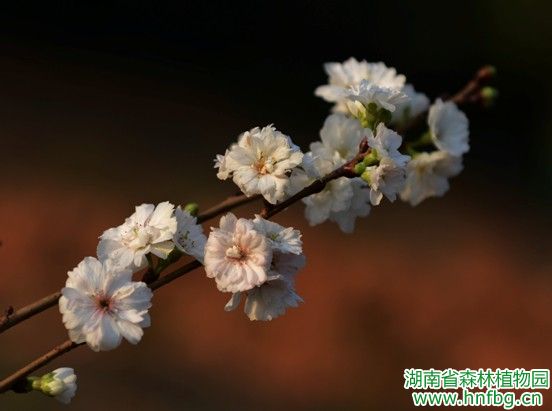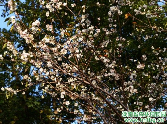 冬樱花在每年十一月中下旬开始开花,一直持续到第二年的二月,花期特别长,为花期最长的品种。冬樱花开花时虽没有早樱、晚樱那样花团锦簇,但在寒风凛冽的冬季迎风开放,倒也有几分坚强。目前我园正在开放的樱花品种有十月樱、冬樱花。