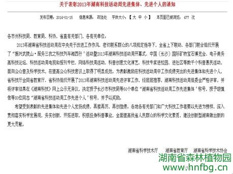 为认真贯彻落实2013年湖南科技活动周实施方案,我园在党委行政的高度重视和直接领导下,积极配合省科技厅等部门,成立专门“2013年科技活动周”工作领导小组,由园主任彭春良担任组长,分管旅游工作的副主任蒋利洪担任副组长,旅游中心科普部为责任部门,从5月19—25日期间紧紧围绕以“科技创新美好生活”为主题开展精彩纷呈的科普活动,圆满完成科技活动周科普活动。被省科技厅、省教育厅、省科学技术协会授予“湖南科技活动周先进集体”称号。自2001年湖南省开展全省科技活动周以来,我园整合优势资源开展科普工作,逐步建立了多元化科普运行机制,经过不断探索和完善,形成全省乃至全国有特色的科普活动品牌。还连续13年荣获科技活动周先进集体、先进个人等荣誉称号。我园这一科普品牌的建立将进一步推进全省乃至全国植物园科普事业的新发展。