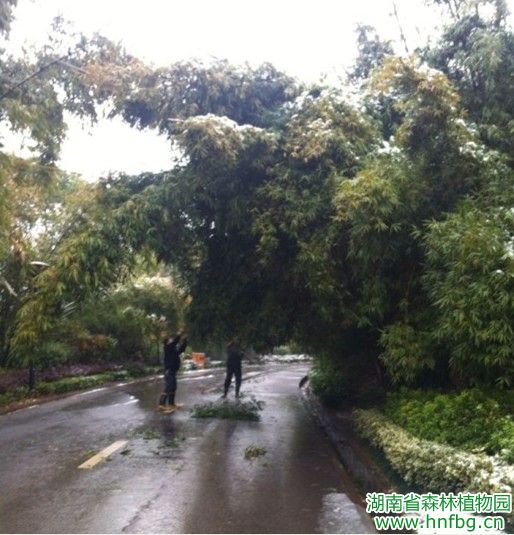 气温骤降,长沙迎来了2014年的第一场雪。园主干道三湘景园入口处的几丛竹子,往年冬天常因积雪重压倒伏路边影响交通。因此,安保处的当班同志一早就穿上雨鞋、拿着长杆,沿着主干道去清理竹枝上的积雪。今天虽然是下雪的第一天,积雪还不算厚,但路边的竹子已经被压弯了,同志们有的用长杆,有的用长耙,很快就把竹枝上的积雪清理干净,压弯的竹枝马上复原了。