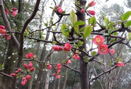 明代《群芳谱》所载“海棠有四品,皆木本,西府海棠、垂丝海棠、木瓜海棠和贴梗海棠”。我园樱花湖畔种植的贴梗海棠便在这蒙蒙细雨中悄然绽放了。贴梗海棠(