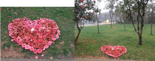 植物园的樱花,特别是山茶花,会一瓣瓣,一朵朵的落满一地,很多游客会怜爱这一地的花,花几个小时的时间把它们摆弄成各种美丽的造型,情侣会把花儿摆成一颗爱心,大人带小孩把花摆成小卡通,还有的游客把落花带回家,烘晒干后做成自已喜欢的干花、、、、