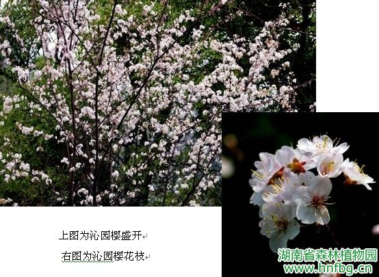 沁园樱”是我园科技人员从染井吉野樱Prunus× yedoensis芽变选育而来的樱花新品种,落叶乔木,一年生枝嫩枝紫红色,微生短柔毛,二、三年生枝紫黑色,树干呈青灰色,树皮上密生眼状斑,比普通染井吉野樱树干略粗糙。成熟叶长椭圆形,纸质,叶正面有茸毛,叶背稀生短绒毛,成熟叶长椭圆形,纸质,叶正面有茸毛,叶柄上有白色茸毛,上端常有2腺体。先花后叶,始花期3月中下旬,终花期3月底4月初,花瓣为5片,呈椭圆形或卵形,在长沙地区11月落叶。
