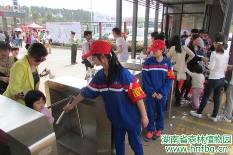 在我园开展的第六届世界名花生态文化节中,每个周末我们都会看到一群整齐划一,头戴红帽子,身穿蓝校服的长沙财经学校大学生志愿者们,他们工作在园区的验票窗口、公交车站台、售票窗口等,以微笑和优质量的服务给游客留下深刻的印象,成为园区又一道靓丽的风景。