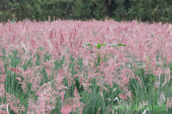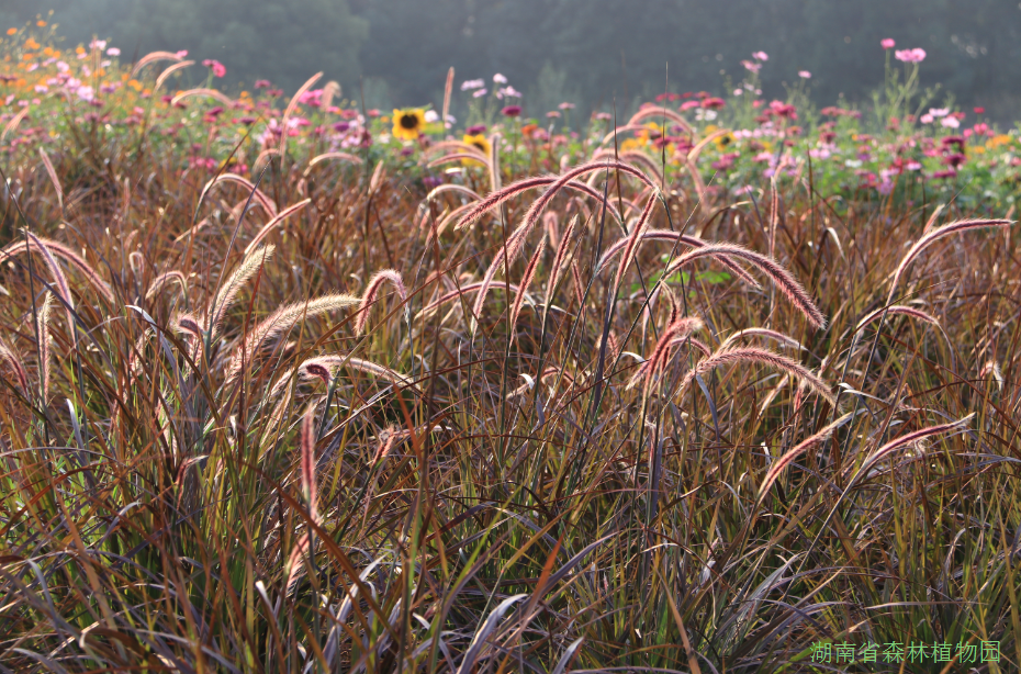 除了大面积的向日葵还有以粉黛乱子草、糖蜜草、金红羽狼尾草、紫叶狼尾草为主打的数十种观赏草。有的花序突出于叶丛之上、有的犹如喷泉般四散、有的悬垂于纤细的茎杆顶端如同浪花在园中翻滚,灵动壮观,尽情展现动态美感。