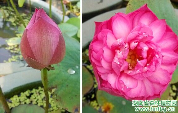 下图是今年第一朵绽放的荷花特写,分别展示了开花前、花开第一天、花开第三天的姿态,单朵花期为3~4天。此品种为中小品种,重瓣红莲,花开时低于叶,初开时为紫红色,开到第三天花色减淡变为粉色,目前还未命名。我园另有一品种名为‘娇容三变’,初开时呈淡粉红色,盛开时粉白色,继而变为白色,还未进入花期。静候它们的花开……