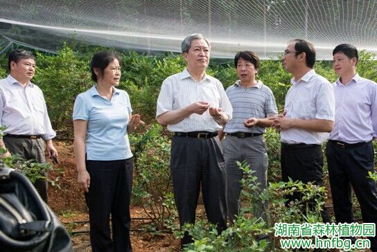 6月12日,国家科技部党组成员、纪检组长郭向远在省林业厅党组成员、总工程师文振军和科技厅党组成员、副厅长贺修铭等人陪同下深入到由我园和湖南省蓝莓研究发展中心共同承担的中央财政林业科技推广项目“蓝莓繁育及丰产栽培技术示范与推广”实施基地进行调研。郭组长在实施基地仔细查看各品种苗木生长和挂果状况,详细询问了实施过程中技术培训、苗木生产等关键环节。陪同考察的文振军总工程师园介绍了近年来南方适栽蓝莓品种选育、技术推广与示范、人才培养、学科建设等方面所取得的成绩,园党委书记王明旭介绍了项目立项以来所开展的技术培训、苗木繁育等主要工作。