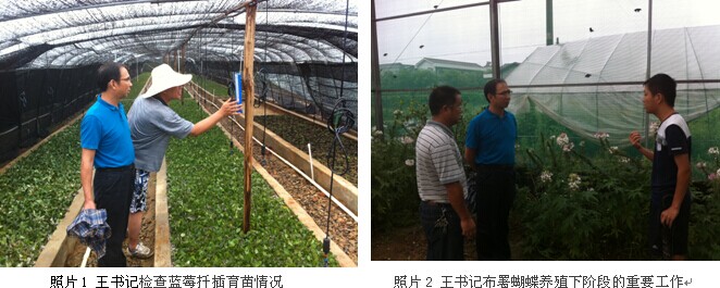 7月15日上午,冒着瓢泼大雨,王明旭书记驱车来到东湖塘基地检查指导工作。一到基地,王书记首先便来到育苗大棚询问蓝莓扦插情况,并扯起几株穗条察看愈伤组织生长和生根情况,要求基地人员对蓝莓扦插工作作好详细记录和统计,完成今年10万株蓝莓的育苗任务,为园里蓝莓产业的发展提供充足优质的种苗保证。基地办负责人就蓝莓嫩枝全光喷雾扦插育苗情况向王书记作了汇报,并表示已基本掌握蓝莓扦插育苗的关键技术,下半年一定完成好10万株蓝莓育苗任务。随后王书记来到蝴蝶羽化室和蝴蝶婚飞笼,现场查看了室内的幼虫饲养和蝴蝶产卵的情况,对下一步的养殖工作做了周密部署,要求养殖技术人员抱着认真、细致的精神开展蝴蝶关键养殖技术项目的实施工作,保证项目顺利实施,完成15万只的蝴蝶养殖的任务。最后,王书记要求基地办人员在下半年抓好各项工作的落实,圆满完成基地今年的各项工作任务。